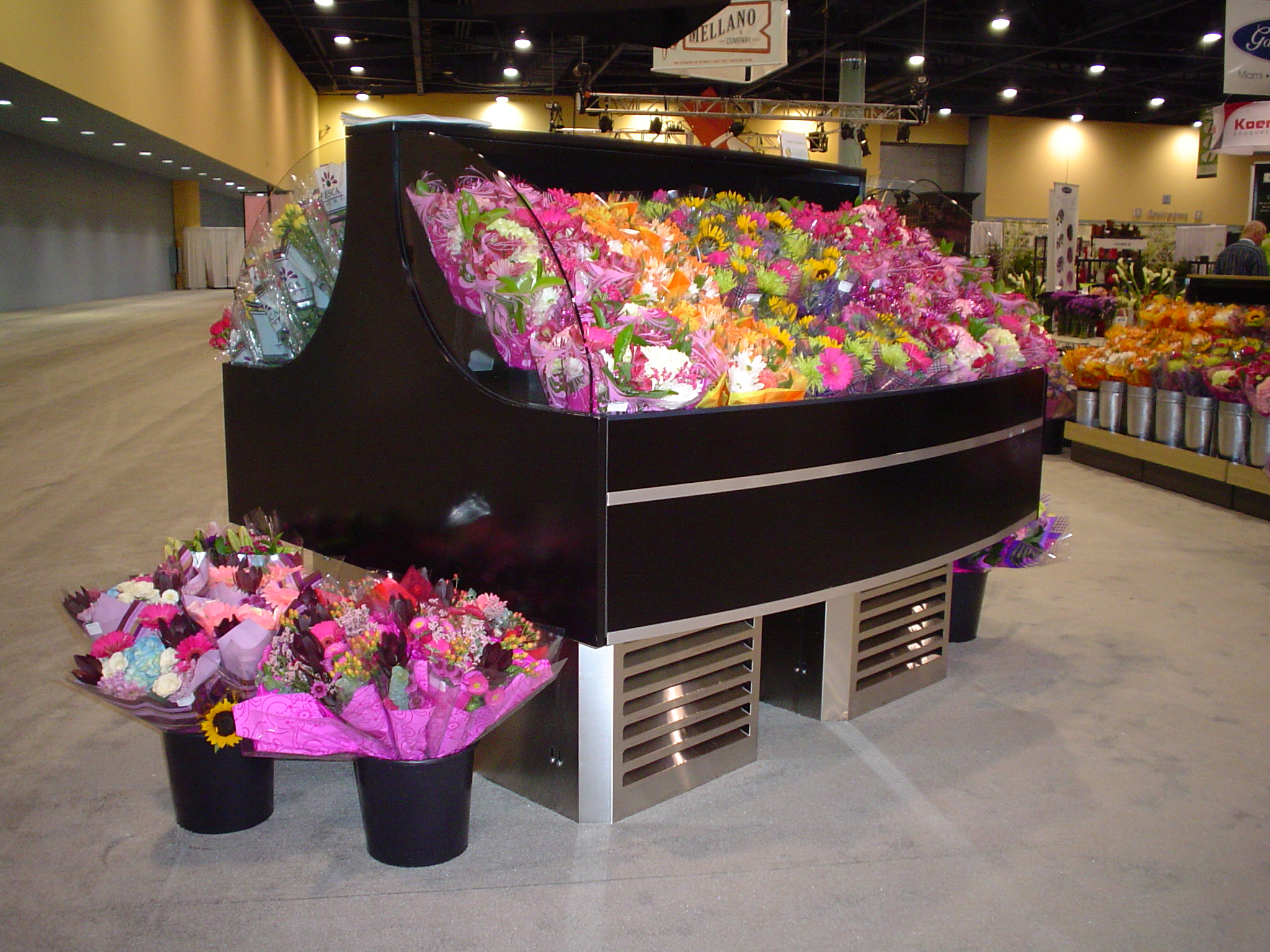 Field of flower merchandisers are two low profiles back to back. Many options are available for field of flowers including pedestals, rounded or curved ends, dry end steps, fresh water exchange, and remote or self contained.